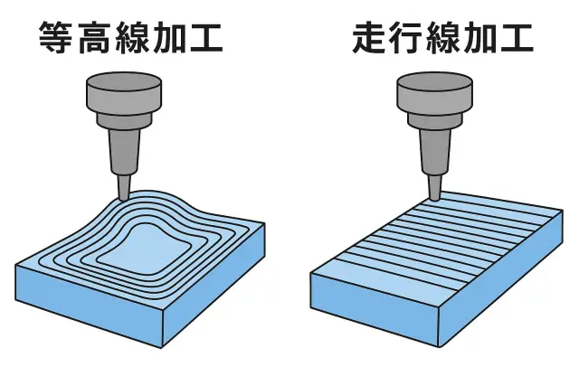 特に曲面加工や3D形状の仕上げ工程でよく使われるのが、等高線加工と走行線加工です。