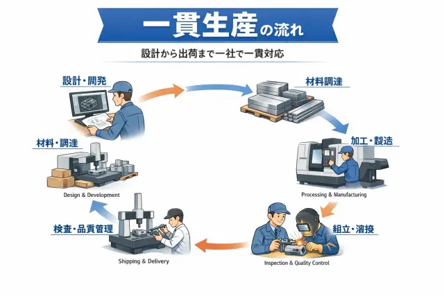 一貫生産とは、製品づくりに必要な工程を社内で連続して対応できる生産体制を指します。